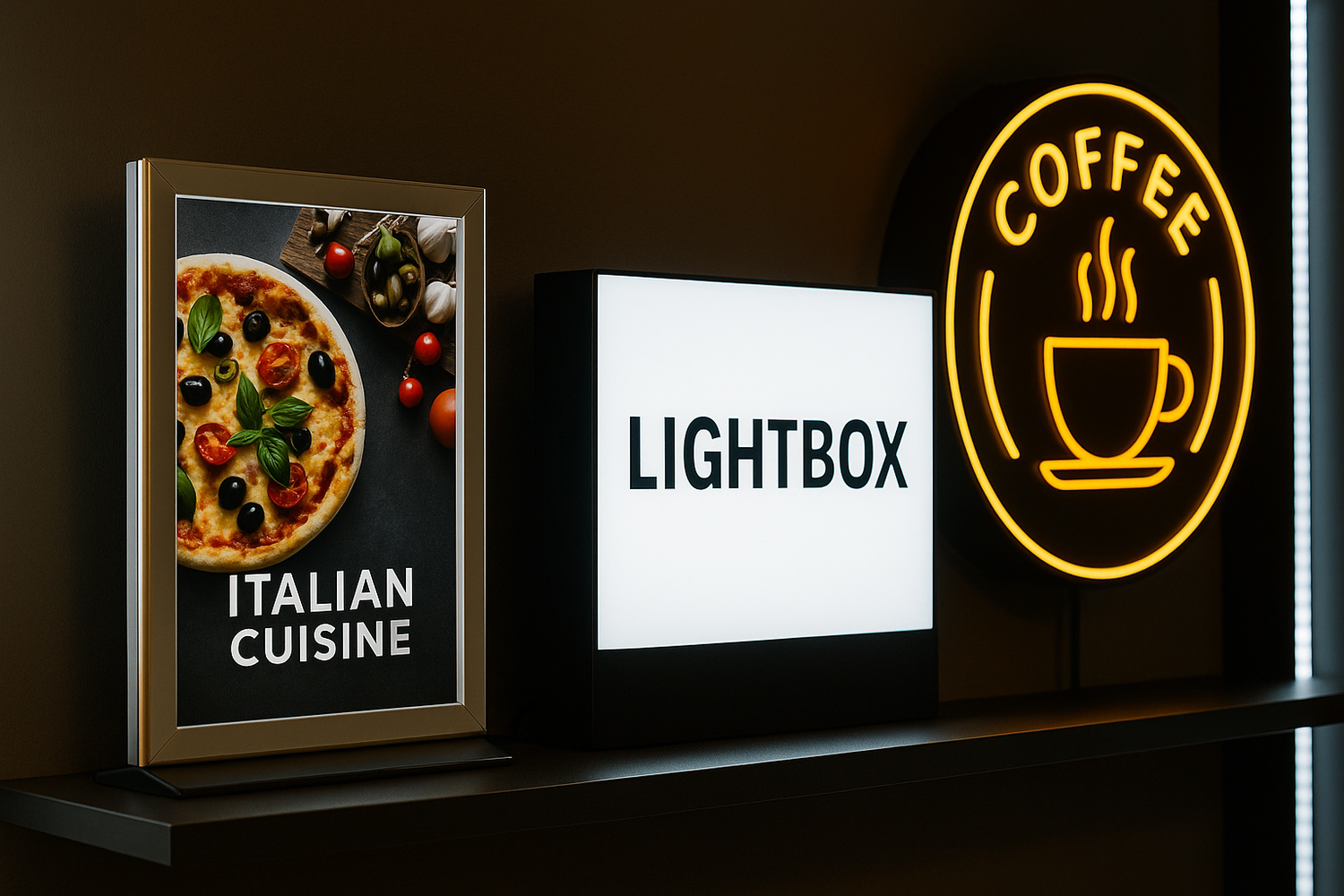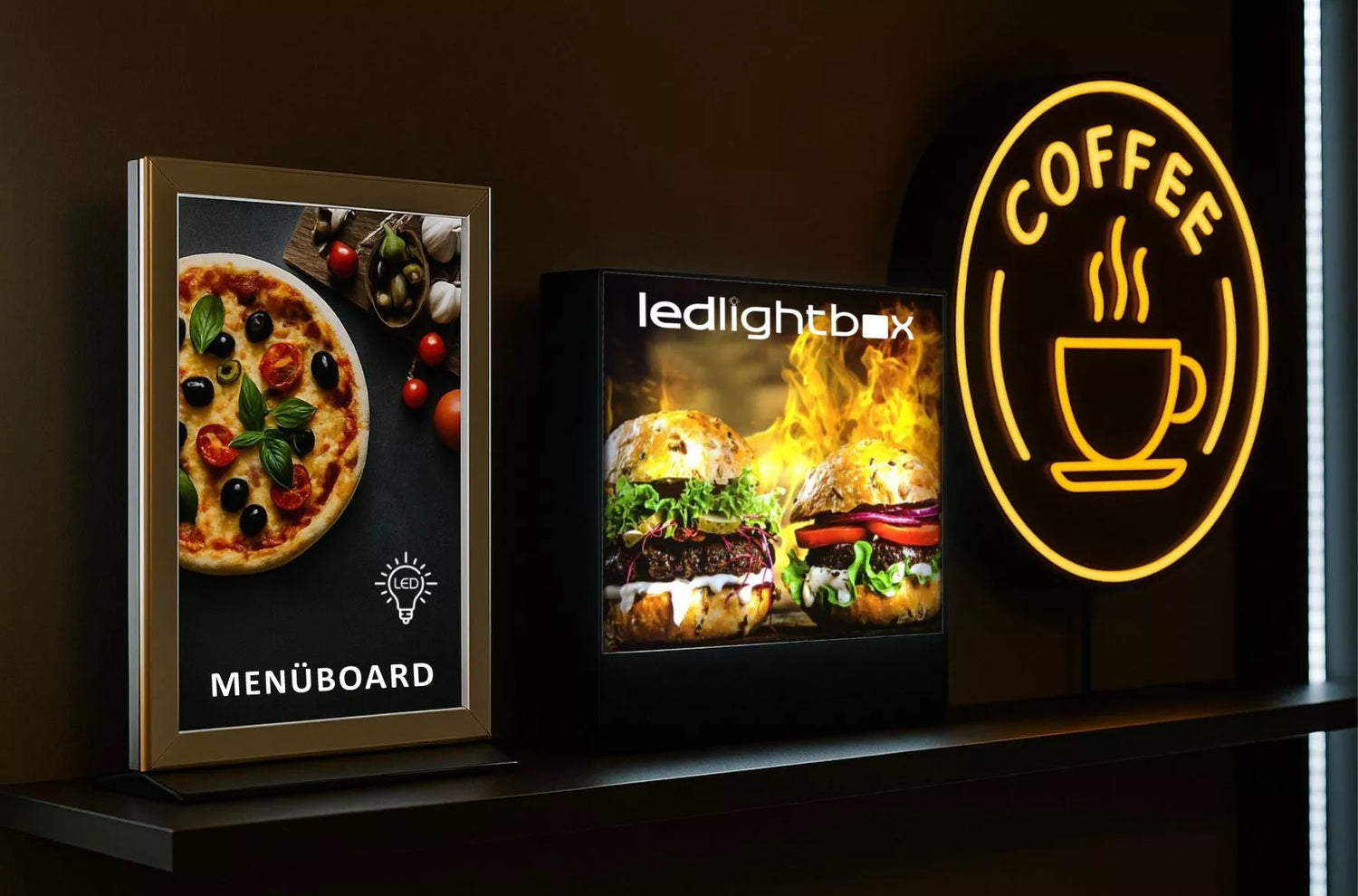Moderne Lichtwerbung mit LED-Technologie für maximale Sichtbarkeit – ideal für Geschäfte, Events und Außenwerbung, Tag und Nacht.